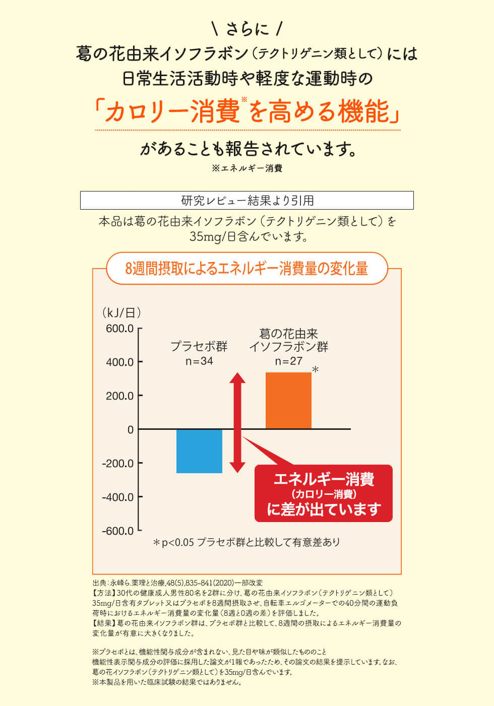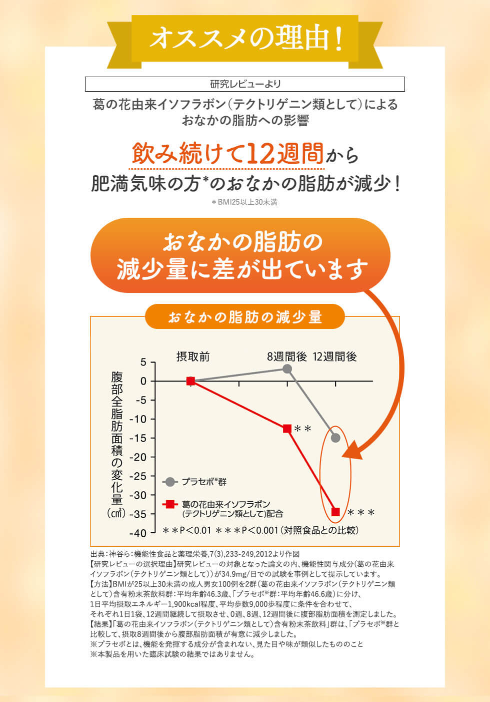 • おなかの脂肪を減らすのを助ける葛の花由来イソフラボン(テクトリゲニン類として)を配合