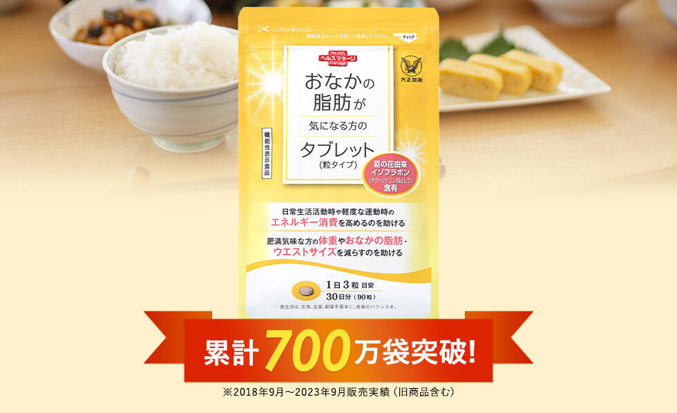 この葛の花由来イソフラボン(テクトリゲニン類として)を配合した「おなかの脂肪が気になる方のタブレット」。累計700万袋※を突破するほど多くの人に支持されているんです!